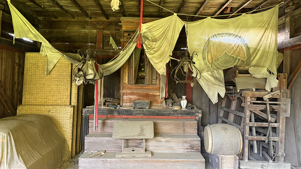 トタンで保護された建物の中に仏像と扁額、絵馬等が残されています。