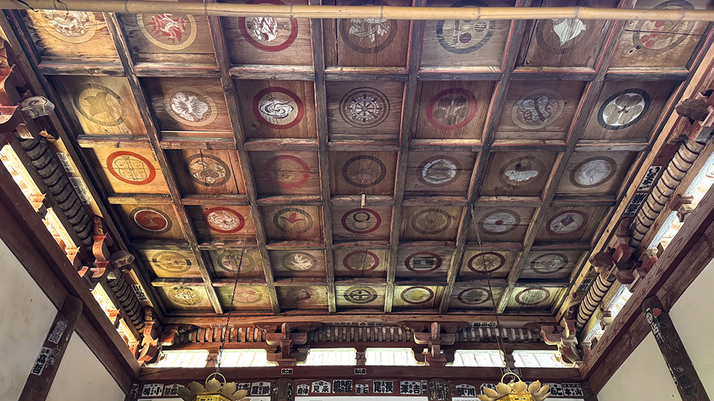 閻魔大王さま以外の十王は石造のようです。後ろにはお地蔵様が6体、格子天井にはたくさんの家紋でしょうか描かれています。