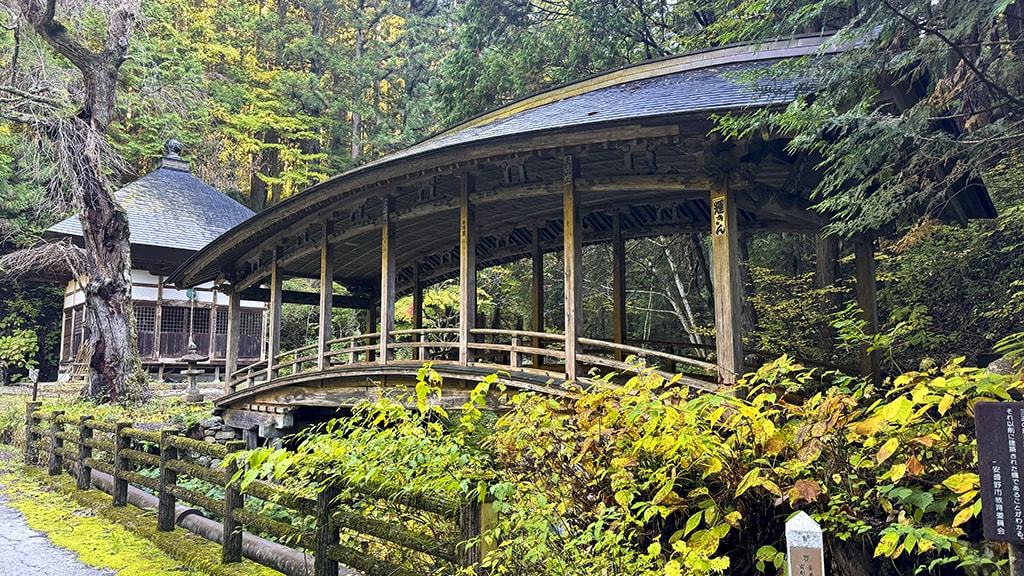 明治三十九年(1906)東穂高村在住で木曽福島の大工瀬川伊勢松が再建をてがけた橋長約15m、橋幅約3.6m、切妻造りの屋根付太鼓橋です。橋板の裏面には、梵字の経文「陀羅尼」が書かれているので、お経橋とも呼ばれ、善男善女が極楽浄土へ渡る橋として親しまれています。