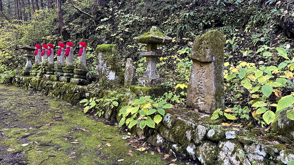 参道にある冠木門をくぐり抜けると右側に六地蔵などの石仏、その先にはきれいな太鼓橋があります。